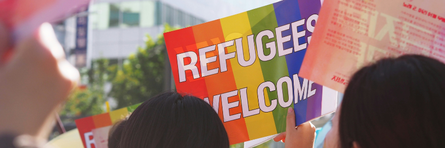 A person holding a sign that says 'Refugees Welcome'